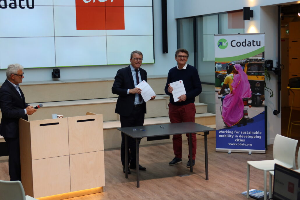 François DUROVRAY, Président de CODATU, a signé des conventions de partenariat avec Nicolas Bauquet, Directeur de L’Institut Paris Region, et Luc Arnaud, Directeur Général du Gret.