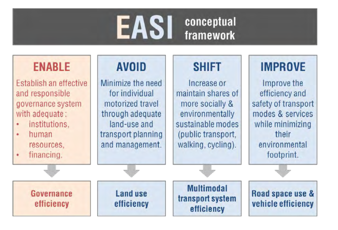 The document proposes a set of policy recommendations included in a conceptual framework for action. The “EASI” framework uses the “ASI” (Avoid-Shift-Improve) concept and adds a vital element to African transport systems: Enable. The latter is focused on the governance system while the rest relates to the transport system itself.