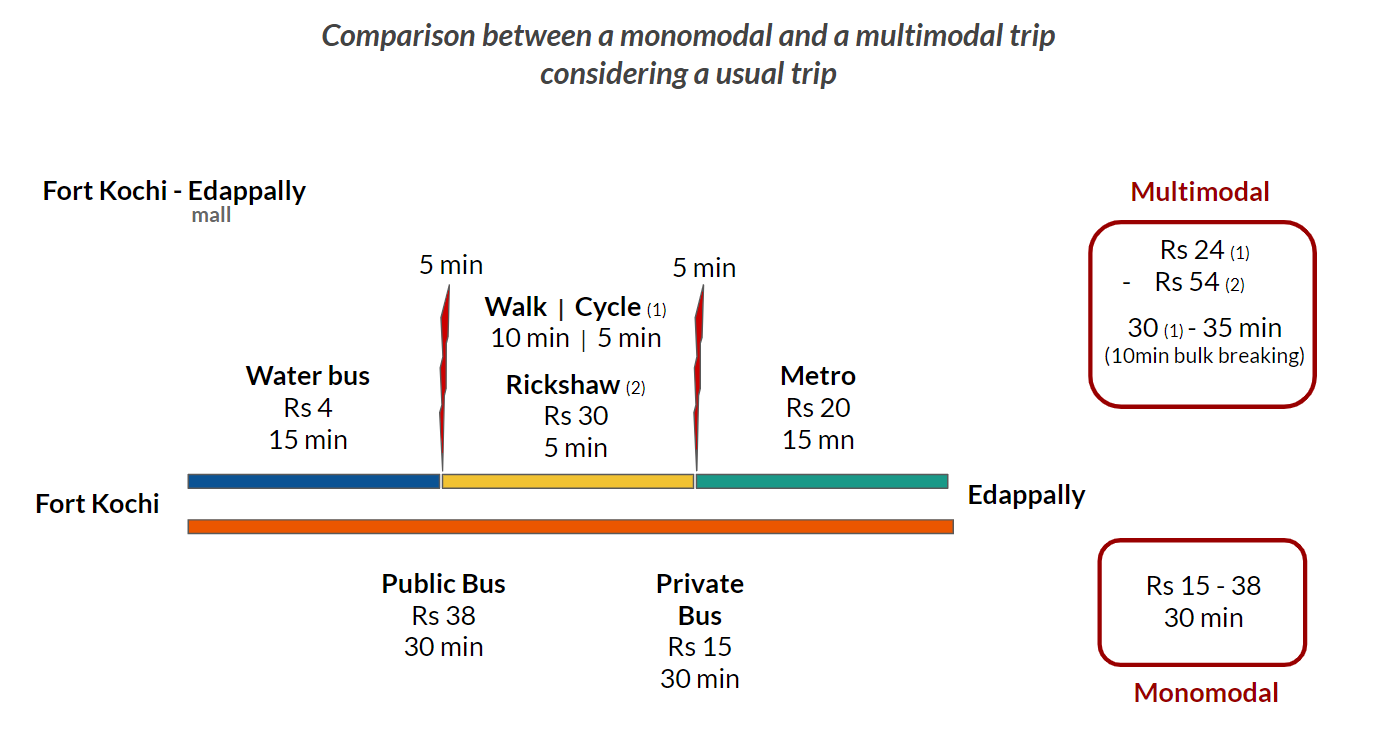 The case of Kochi is particularly interesting considering the diversity of means of transport which the inhabitants can access : train, public and private buses (for short, medium and long distance journeys), metro, boats, auto-rickshaws, taxi, not to mention cycling and walking. Despite the diversity of transport means and the relative performance of each of them, the network is still not conducive to multimodal travel. This can be explained by the competition between metro and bus on the main road, the non-synchronization of the schedules between the different modes, the cost of multimodal journeys and the cruel lack of passenger information on a particular mode and the complete lack of information facilitating mode transfers within infrastructures. Moreover, bulk breakings remain significant and there are still serious equipment deficiencies at terminals and metro stations to address the first and last mile connectivity (pedestrian accessibility, bike parks, rickshaw drop-off, etc.). In addition, the network still covers only 49% of the territory of the Greater Kochi and the service frequency is significantly reduced after 8pm.