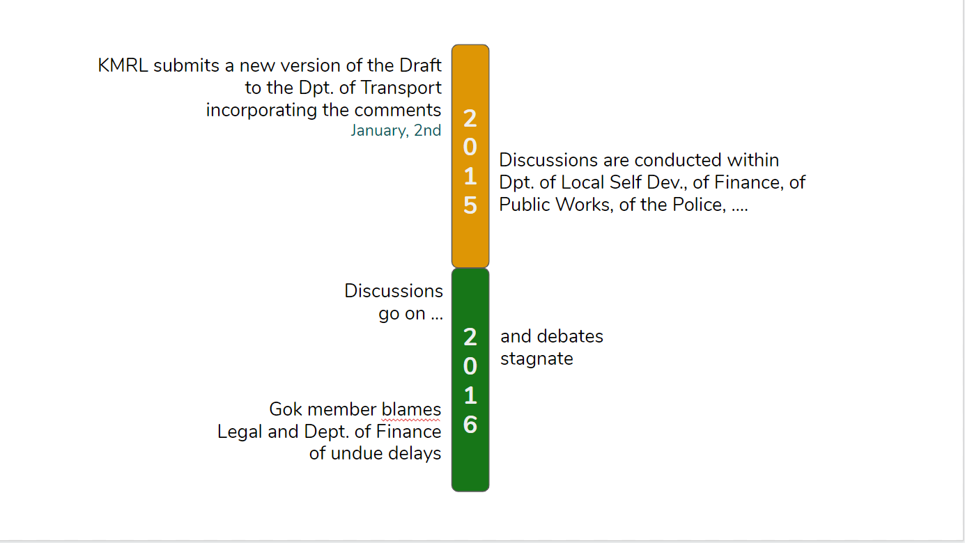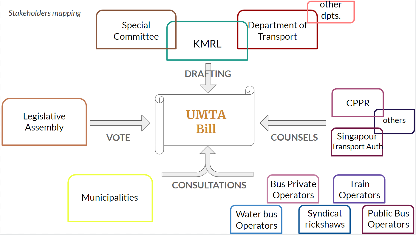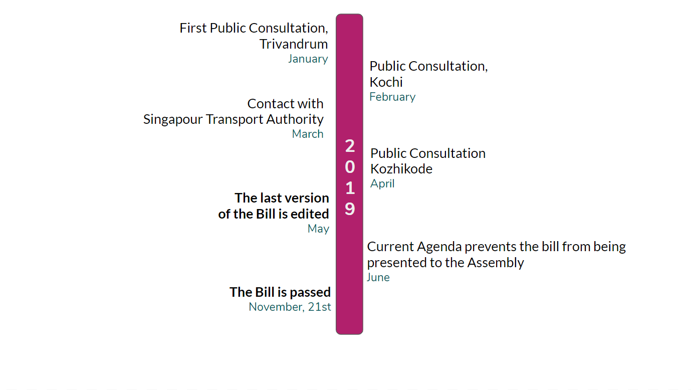 After a first version proposed by KMRL, the bill went back and forth a number of times between the metro company and the government. A Special Committee composed of 15 members of the Legislative Assembly and the Minister of Transport was formed to lead the debates on the content of the text and to organize meetings bringing together all the stakeholders of transport and external “experts” (in particular Centre for Public Policy Research, a Kochi-based institute of political science and members of Singapore’s UMTA). Public consultations for each of the three urban areas to host its own UMTA (Kochi, Kozhikode and Trivandrum) were also held.