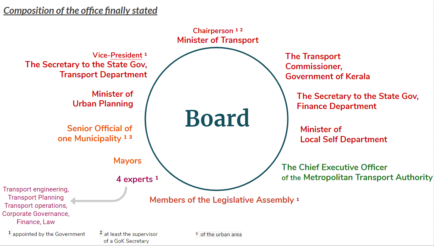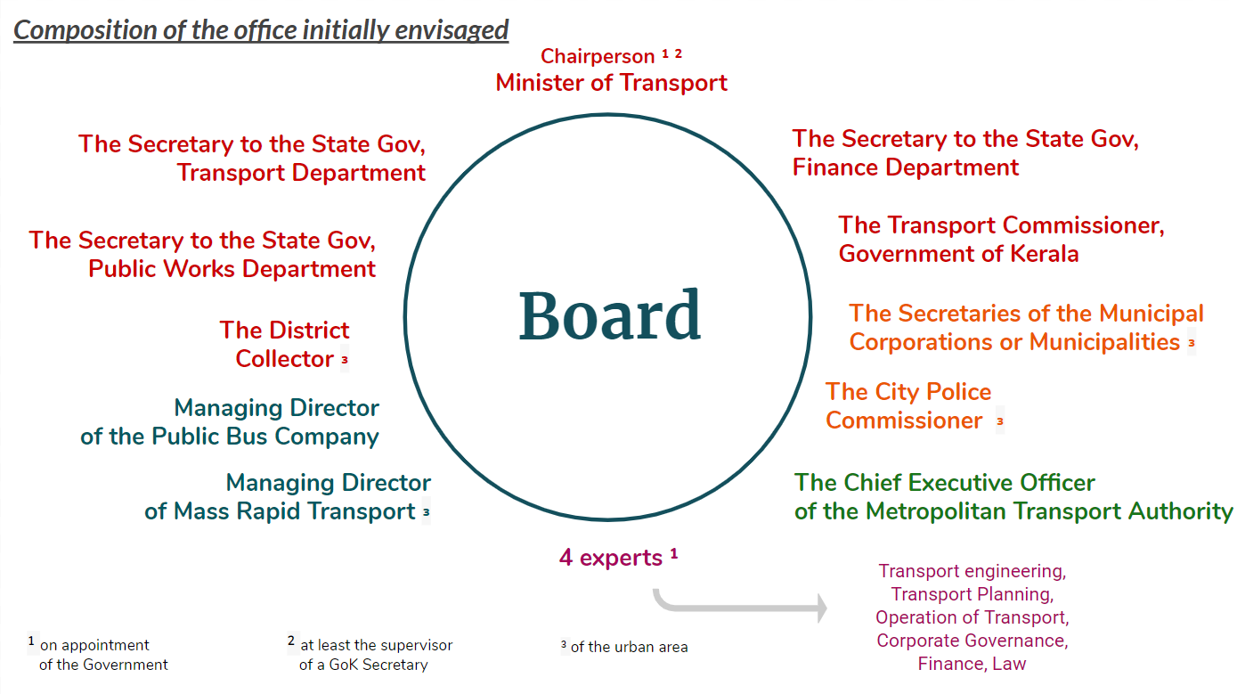 «Since 1986, at the central level, the responsibility for urban transport planning rests on a single ministry: the Ministry of Housing and Urban Affairs (MoHUA). At the state level, the Department of Transport is responsible for steering transport policy. In Kerala, as in other states, there is a fragmentation of responsibilities between a multitude of institutions: