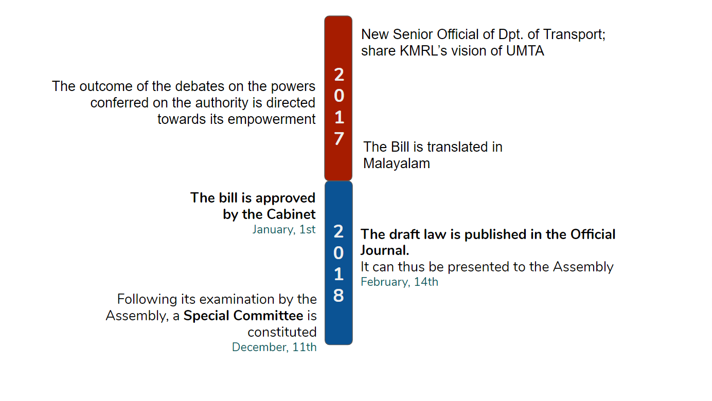 With its technical capabilities and legitimacy, while the Government of Kerala (GoK) was slow to take matters into its own hands, KMRL took the initiative to draft a regional bill laying down the legislative framework for the implementation of an Urban Transport Authority (UMTA) Bill. The law was then expected to be adopted by the end of 2016, but the legislative process has been considerably extended, and the bill was not put to the vote of the Assembly until October 2019. On May 2, 2019, the latest version of the bill was edited following a meeting at the initiative of the Head of the GoK Department of Transport and bringing together the Commissioner of Transports, the Chief of Urban Planning, representatives of the Department of Finance, the Department of Transport, the Department of Planning and Economy, the Department of Local Development, and the Legal Department, as well as members of KMRL’s Transport Planning Department.