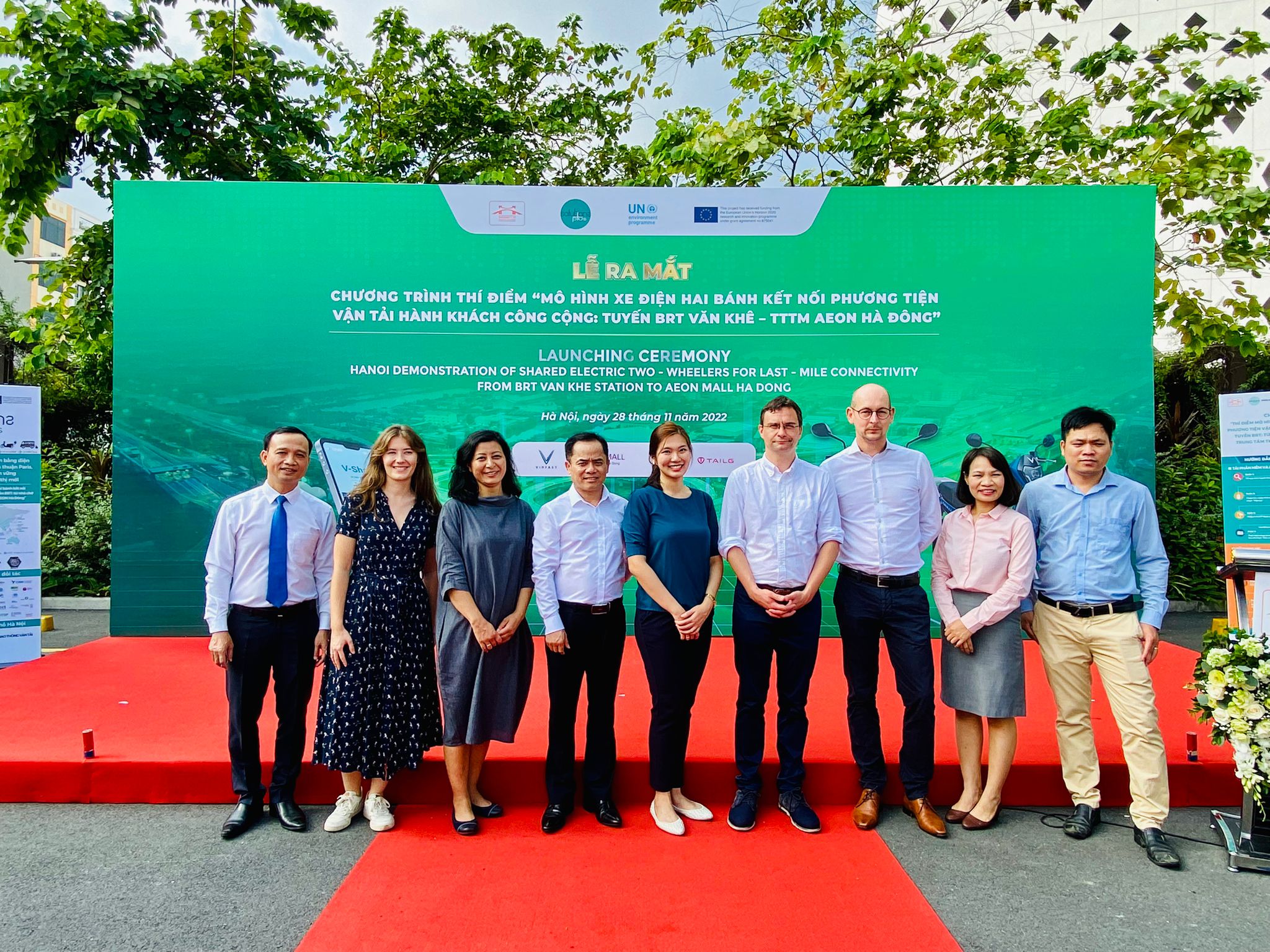 Le 28 novembre dernier a eu lieu le lancement de ce projet pilote sur le site du centre commercial. La cérémonie de lancement était organisée par le partenaire local, l’Université de Technologie du Transport avec le soutien de Clean Air Asia, le Wuppertal Institute et Urban Electric Mobility Initiative, avec la présence du Comité du Peuple d’Hanoi. CODATU était représentée par Noémi Mené, chargée de mission. Après la cérémonie officielle, les différents participants ont pu tester les scooters électriques et faire le trajet jusque à  la station de BRT. Les médias locaux ont couvert l’évènement en vidéo (en vietnamien).