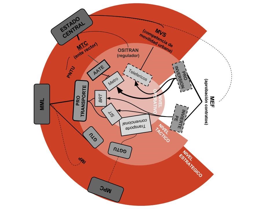 El Estado juega un papel importante a través de dos otros ministerios. En primer lugar, El Ministerio de Transportes y de Comunicaciones (MTC) que es el ente rector del sector que acompaña las Municipalidades en el marco de una nueva Política Nacional de Transporte Urbano (PNTU) y es responsable de los proyectos ferroviarios mediante la Autoridad Autónoma del Tren Eléctrico (AATE) que está a cargo del proyecto de red básica del Metro de Lima-Callao. En segundo lugar, el Ministerio de Economía y Finanzas tiene también un rol importante en el proceso de licitación de las concesiones de transporte urbano a través de PROINVERSION e INVERTE.PE o en la regulación de la infraestructura a través de OSITRAN que está directamente relacionado con el Concejo de Ministros. Por último, a este panorama institucional complejo, se tiene que agregar el Ministerio de Vivienda Construcción y Saneamiento (MVCS), el cual tiene la competencia de movilidad urbana desde 2014.