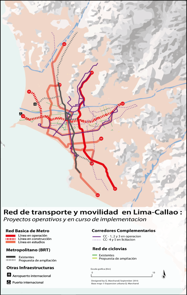 Esta fragmentación en distintos niveles territoriales y administrativos complica la gestión de un espacio metropolitano cuyas problemáticas de planificación urbana y de regulación del transporte son totalmente conectadas. Por ejemplo, el Instituto Metropolitano de Planificación (IMP) está a cargo de la planificación urbana para la MML sin incluir el Callao que tiene su propia entidad de planificación. Hubo un intento de realizar una propuesta común de planificación en 2014, durante la gestión municipal de Susana Villarán, cuando se realizó el PLAM 2035. Sin embargo, tras la llegada del actual alcalde Luis Castañeda, este instrumento de planificación no se ha aprobado. Sin plan vigente, el rol del IMP durante esta última gestión se ha reducido en aprobar los Planes de Desarrollo Urbano (PDU) formulados por los distritos. Además del rol menor de la planificación, no existe un vínculo fuerte con los proyectos de transporte. A parte del PLAM 2035 que consideraba las futuras líneas de metro y la creación de centralidades periféricas, ningún plan urbano incluye los distintos planes de transporte que han sido propuestos en las dos últimas décadas (ver cronología). De hecho, la gestión actual ha ejecutado al contrario obras viales que no estaban planificadas o interferían con obras planificadas.