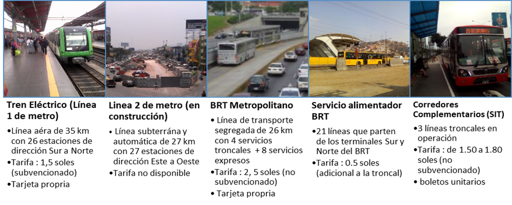 Finalmente, conviven dos sistemas de transporte masivo, un BRT (el Metropolitano) y una línea de metro elevado (el Tren eléctrico) que van ambos de norte a sur, pero no se interconectan a nivel físico o tarifario. Son privilegiados por la población, pero representan aún una minoría de los desplazamientos.