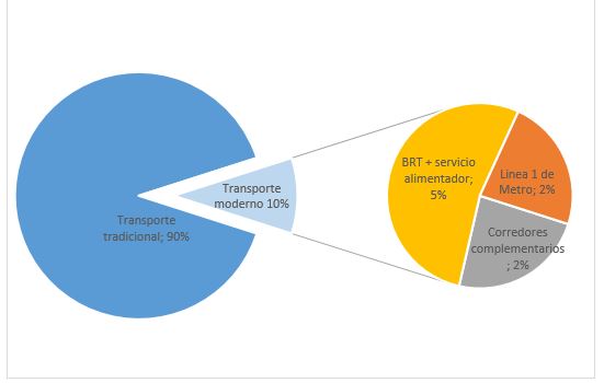 El sistema actual del transporte está todavía liderado por los ejes de transporte tradicional que tienen rutas largas que van de un extremo al otro de la ciudad y se superponen en los ejes centrales con mayor demanda. La autorización de operar en estas líneas está otorgada a varias empresas de buses que arriendan las unidades de transporte de diversos tamaños (ver más abajo) a los chóferes y cobradores que compiten en la denominada “guerra del centavo”. En algunos distritos, mayormente de la periferia, los mototaxis organizados en empresas o asociaciones complementan este sistema para trayectos cortos y/o hacia las laderas.