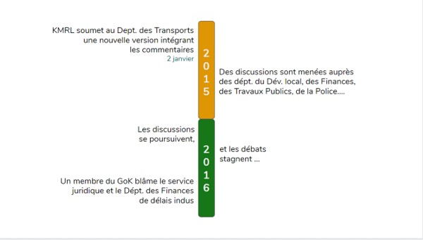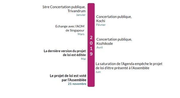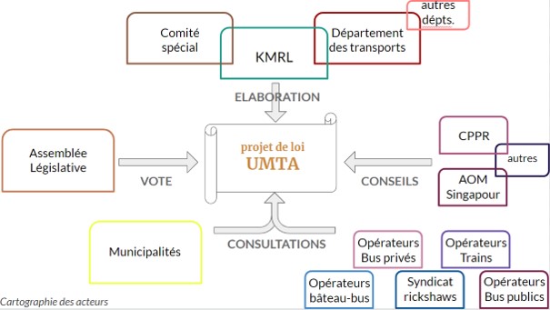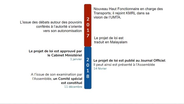 Après une première version proposée par KMRL, le texte de loi a subi de nombreux aller-retour entre la société de métro et le gouvernement. Un Comité spécial composé de 15 membres de l’Assemblée Législative ainsi que du Ministre des Transports a été formé afin de mener les débats sur le contenu du texte et d’organiser des réunions rassemblant l’ensemble des acteurs des transports et des “experts” extérieurs (en particulier CPPR, institut de sciences politiques basé à Kochi ainsi que des membres de l’AOM de Singapour). Des réunions de concertations publiques pour chacune des trois aires urbaines ayant vocation à accueillir sa propre UMTA (Kochi, Kozhikode et Trivandrum) ont également été tenues.