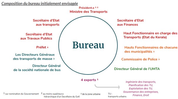 De par son rôle prépondérant dans la mise en place de cette institution, il était initialement prévu que KMRL se mue elle-même en UMTA (Urban Metropolitan Transport Authority). Il a finalement été décidé que les deux institutions devraient être strictement distinctes. En fait, alors que l’UMTA avait à l’origine vocation à rassembler sous une même égide l’ensemble des organes exécutifs et des acteurs des transports du Grand Cochin, la dernière version du projet de loi (qui sera celle soumise au vote de l’Assemblée Législative en octobre 2019), prévoit une structure bien différente. Ainsi, un aspect fondamental qui a été amplement débattu entre les différentes parties prenantes a été la définition des membres de cette UMTA : L’institution doit-elle se composer de l’ensemble des opérateurs ? les opérateurs publics ? Ou bien ces derniers doivent-ils être exclus de ses instances ? Autrement dit, l’institution doit-elle par essence être gouvernée par les rapports de force entre les différents acteurs ? Ou bien doit-elle être exempte de tout conflit d’intérêt en son sein, et se positionner “au dessus” des opérateurs ? A cet égard, M. O.P. Agarwal, Directeur Général du World Resources Institutes (WRI), note : “Il me semble difficile de trouver un “expert” digne de ce nom sans que celui-ci soit associé à quelconque affaire du secteur des transports urbains. Après tout, ce sont ces organismes qui fournissent des analyses pertinentes. Peut-être que le compromis pourrait consister à exclure les opérateurs des transports urbains et auxiliaires, et laisser la possibilité d’inclure les personnes de l’enseignement et de la recherche ainsi que les consultants.”