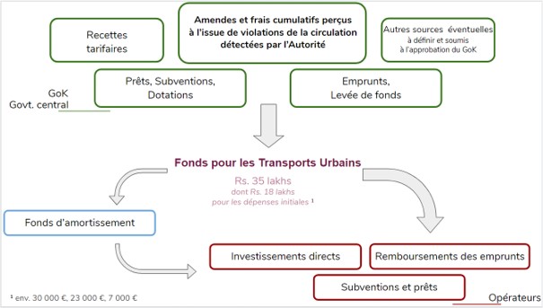 L’autonomie de chaque UMTA (Kochi, Kozhikode et Trivandrum) sera par ailleurs renforcée par la mise en place d’un fond propre à chacune : l’Urban Transport Fund. Des premières versions du texte ont été critiquées comme étant trop rigides relativement à la définition de ce fond et à la nature des sources de financement. Finalement, l’UTF devrait fonctionner comme suit.
