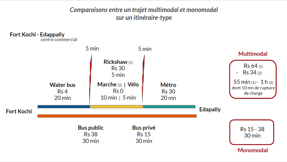 Le cas de Kochi est particulièrement intéressant de par la diversité des moyens de transport dont les habitants disposent : train, bus publics et privés (pour des trajets de courte, moyenne et longue distance), métro, bateaux, auto-rickshaws, taxi, sans oublier le vélo et la marche. Malgré la diversité de l’offre de transport et de la performance relative de chaque offre prise individuellement, le réseau est encore peu propice à des déplacements multimodaux. De par la concurrence entre métro et bus au niveau de l’axe routier principal, la non-synchronisation des horaires entre les différents modes, le coût des trajets multimodaux ou encore le cruel manque d’informations relatives à un mode en particulier et l’absence totale d’informations facilitant les changements de mode au sein des infrastructures. Les ruptures de charge restent par ailleurs conséquentes et subsistent d’importantes déficiences en terme d’équipement répondant à la problématique des premier et derniers kilomètres au niveau des terminaux et stations de métro kilomètres (accessibilité piétons, parkings à vélo, dépose-minute pour les rickshaw, …), … De plus, le réseau ne couvre encore que 49% du territoire du Grand Kochi et la fréquence de service est significativement moindre 20h passée.